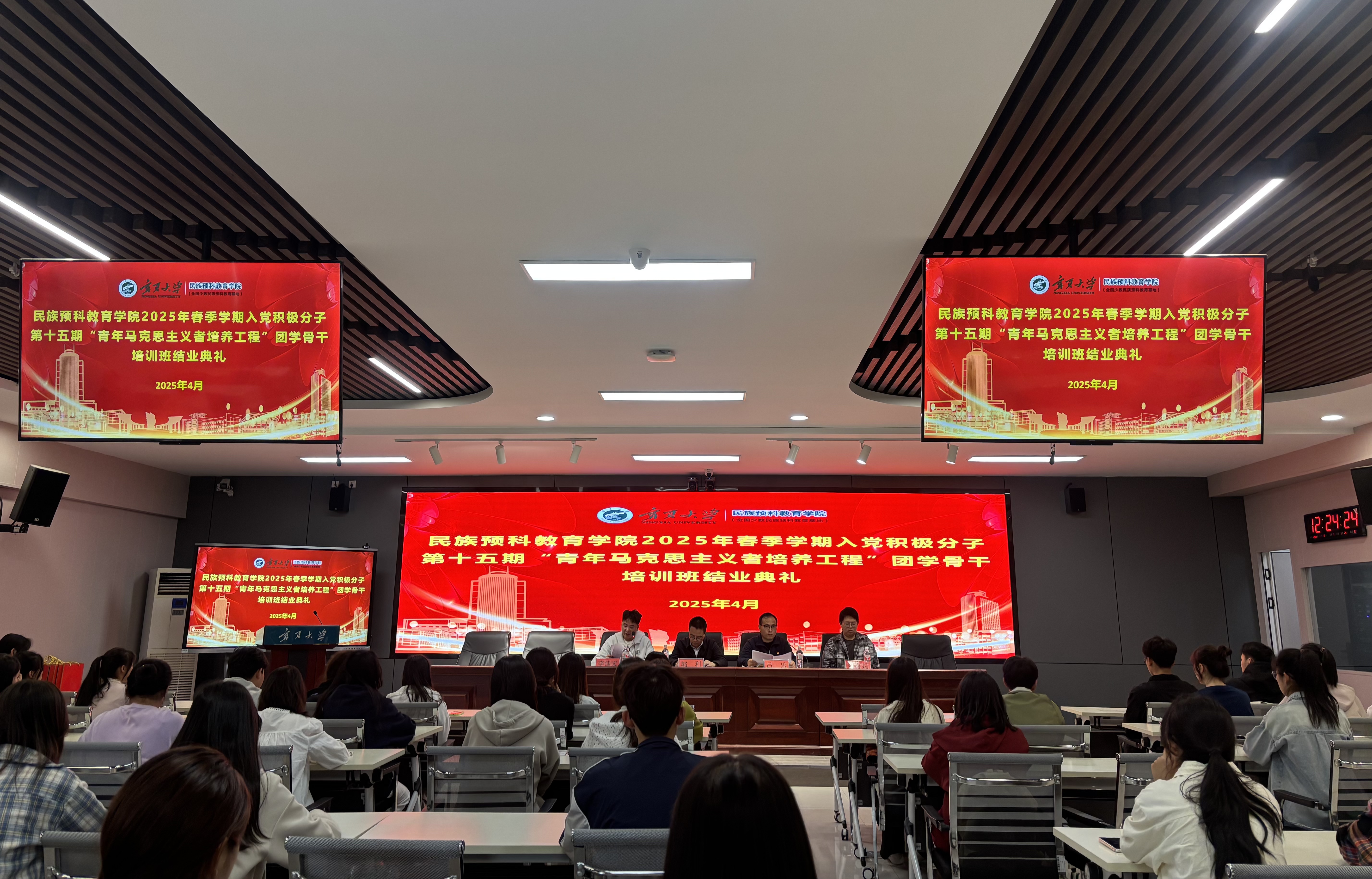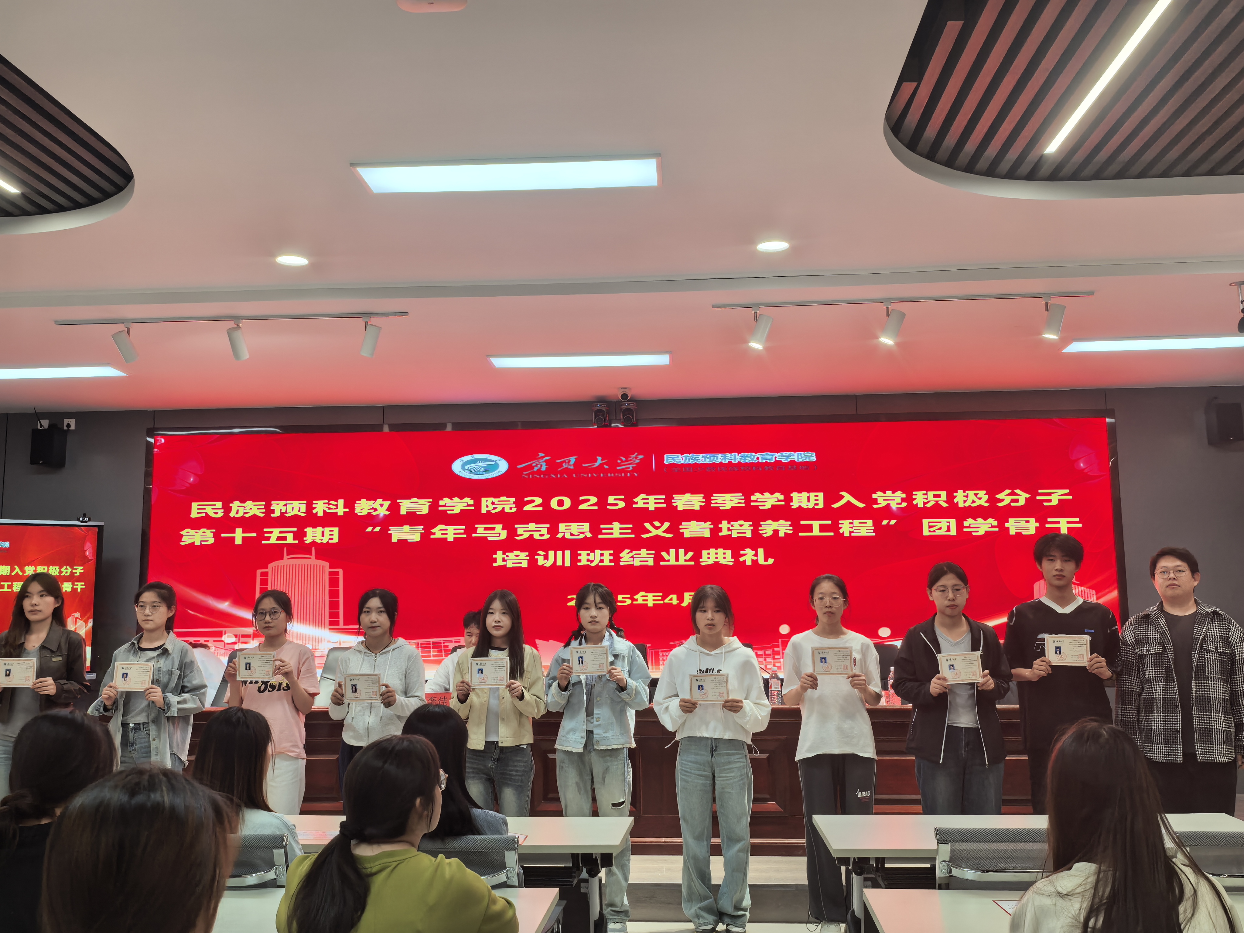 4月23日中午,体育平台官网于田家炳楼601室举行2025年春季学期入党积极分子暨第十五期“青年马克思主义者培养工程”团学骨干培训班结业典礼。公司党总支副书记郭利、兼职辅导员李佳文和魏有亮出席结业典礼,培训班全体学员参加。典礼仪式由吕乐主持。