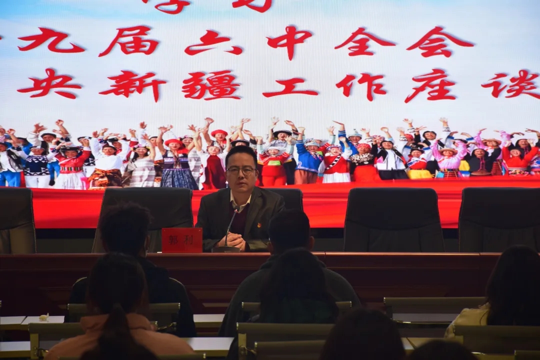 随后,郭利老师又讲解了第三次中央新疆工作座谈会的主要内容,分享了身边的民族团结故事,希望同学们能够坚定不移听党话、感党恩、跟党走,团结友爱、共同进步,像石榴籽那样紧紧抱在一起,铸牢中华民族共同体意识。