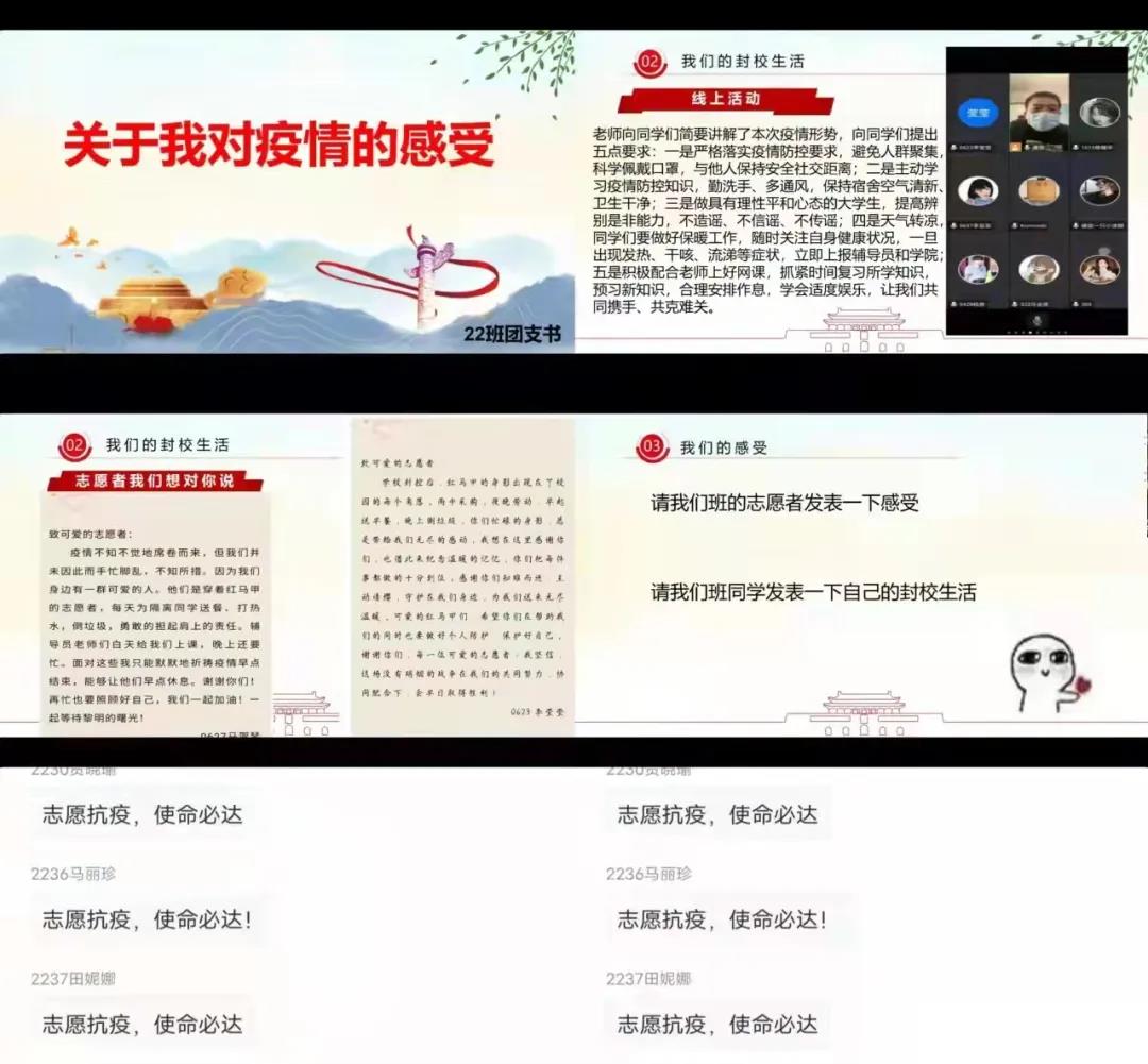 同学们通过讲述故事、交流讨论等形式,分享了公司师生携手抗击疫情的众多事例,其中让同学们印象深刻的是:为让隔离员工吃饱吃好,公司领导和老师同餐厅负责人多次沟通协商,要按时按质按量做好三餐;郭利老师和隔离同学进行线上交流,教导大家调节负面情绪,原博老师又回答了隔离同学关心的日常生活问题;辅导员老师写信给隔离同学,为同学们加油打气;志愿者员工为隔离员工送餐、打热水、取快递、倒垃圾……同学们看到了尽职尽责的老师,体会到了志愿者同学的辛苦付出,深切地感受到了预科大家庭中的关爱和温暖,深刻理解了伟大抗疫精神。