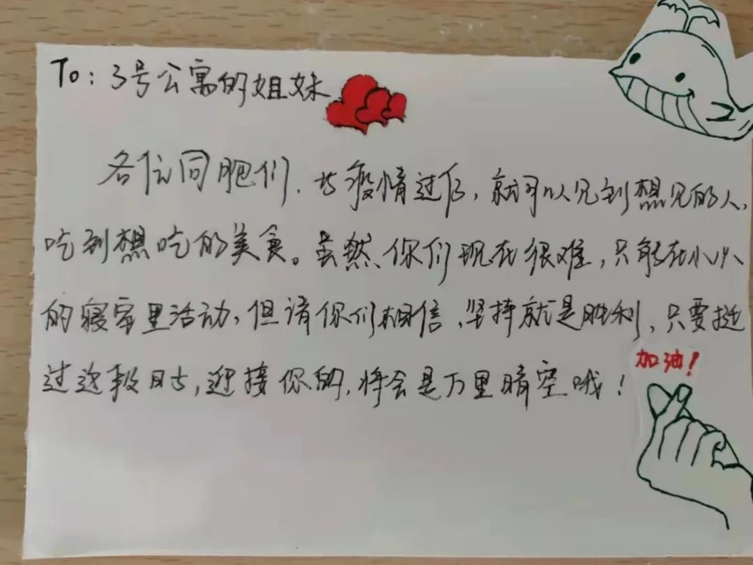 为进一步加强同学间交流,关心关爱隔离同学,11月5日,公司团委组织员工开展“我想对你说”爱心信箱传递活动。同学们将自己想对隔离同学说的心里话写下来,以纸条、便签的形式投入爱心信箱,通过3号楼志愿者送入隔离同学手中。一张张手写纸条,满载着真诚的祝福与关爱。收到爱心纸条的同学们表示很暖心,感受到了同学间的温暖情谊。