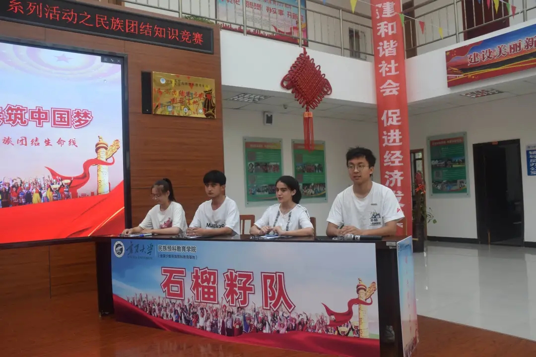 公司学子分别组成了“石榴籽队”和“沙枣树队”代表队,共有45名同学参加本次知识竞赛。本次知识竞赛分为必答题和抢答题环节。上午9点,随着主持人的开场白,本次活动正式拉开序幕。在必答题环节中,分别代表“石榴籽队”和“沙枣树队”代表队的8位同学,表现出扎实的民族团结知识功底和良好的表达能力,也展现出公司学子手拉手、心连心的良好风貌,赢得了全场的阵阵掌声。在抢答题环节中,台下同学利用易班微助教进行积极抢答,体现出了公司学子积极向上、敢于争先的精神。比赛最后,由公司回族、维吾尔族、哈萨克族、东乡族、蒙古族、满族、土家族、壮族八个少数民族员工代表组成的舞蹈队,带来热烈的民族舞蹈,将大家带入了欢乐的海洋。