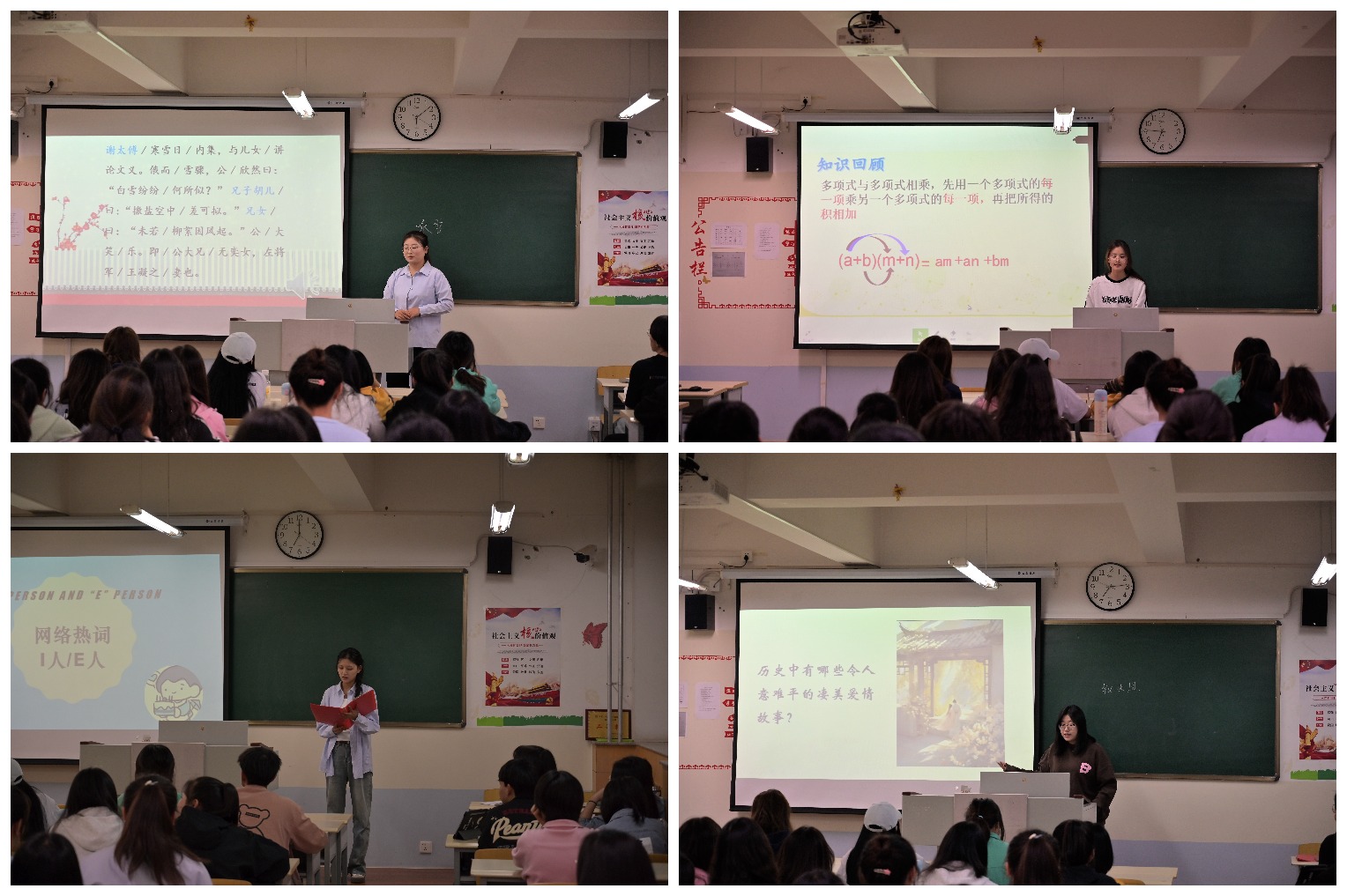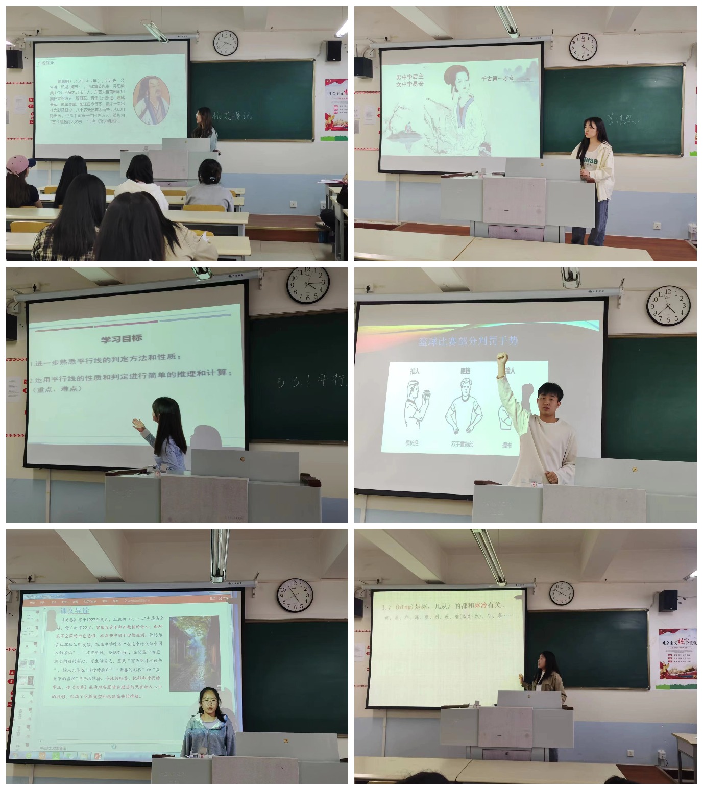比赛从教师教态、授课内容设计、教法学法、多媒体使用、板书设计等方面对选手进行综合考核。各参赛选手结合自己所学的知识与老师传授的经验向大家展示教学风采,大家讲课材料准备充分,课堂教学目的明确,教学思路清晰,语言表达准确精炼。马晓莉同学以“关爱老员工心理健康”为题,倡导员工加强心理健康维护;马欣颖、田静、田荣荣同学以词作为引,带领员工们领略古代文学的韵味;马利伟同学对平方差公式的细致引导和讲解,进一步培养了员工发现规律、自主总结的学习能力;何迎同学通过文言文实词推断法,让员工感受文言文的魅力;李慧同学以数学中不同角的位置为例,让员工更好地理解数学知识;马淑霞《雨巷》的朗诵,杨虎斌同学对篮球赛事判罚手势的讲解,展现了多元化的教学内容和方式。选手们流畅的讲解,优美的板书,端庄大方、挥洒自如的仪态,展现了师范预科学子的教学技能和教师风采。