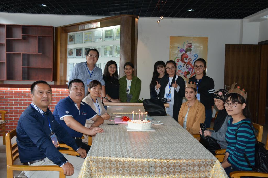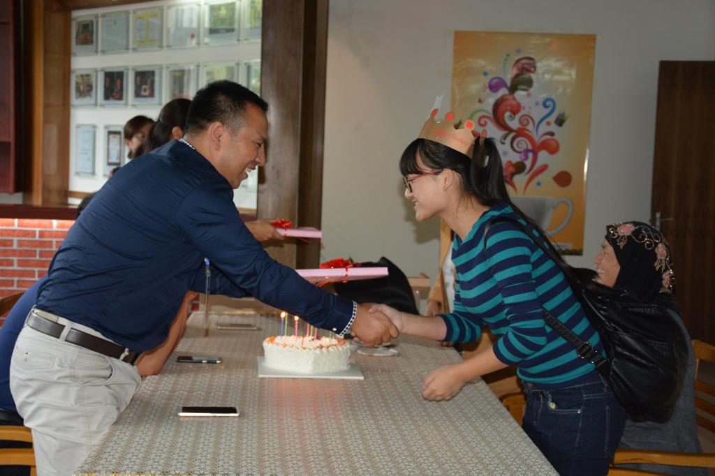 当日下午,经理马亦兵在翻看报到注册同学情况登记表时发现,来自云南大理的回族姑娘黄孝月与来自新疆的维吾尔族姑娘凯迪热都是9月17日的生日,于是公司领导决定给这两位姑娘一个惊喜,老师专程去蛋糕房买了装裱精美的蛋糕,并为两位同学精心准备了生日礼物。下午四点,文质书院常务经理马强分别与两位同学取得联系,邀请两位同学携家人及朋友一同到田家炳教学楼“角落咖啡屋”参加生日聚会。一同给两个姑娘庆生的还有公司党总支书记戴兴安,副书记郑燕玲,副经理阿利木江,学办主任常江及辅导员代表。老师们为两个同年同月同日生的孩子一起唱生日歌,送祝福,看着她们一起许愿、吹蜡烛、切蛋糕,场面十分温暖。黄同学的母亲表示非常激动,很感谢院领导的悉心关怀,使孩子们能够在离开家到公司的第一天就感受到家一般温暖,过了一个很有纪念意义的生日。