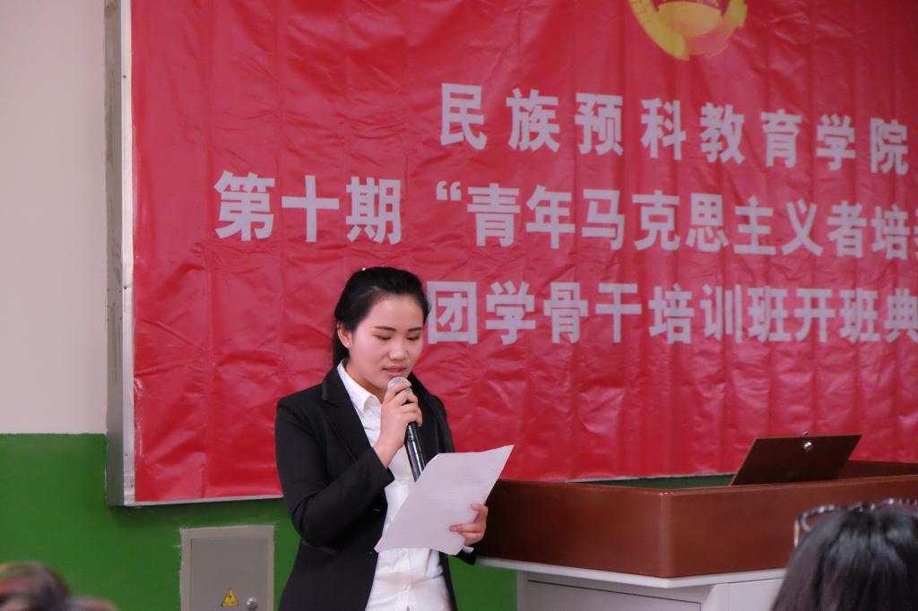 开班典礼在庄严的国歌声中拉开帷幕,全体师生起立一同高唱国歌。接着,由团委副书记谢婧老师宣读本期“青马班”员工名单,由学办主任常江老师宣读“青马班”实施方案,员工代表古丽向同学们宣读了“青年马克思主义者培养工程”的重要意义,并呼吁同学们通过教育培训和实践锻炼等行之有效的方式,不断提高自身思想政治素质、政策理论水平、创新能力、实践能力和组织协调能力。