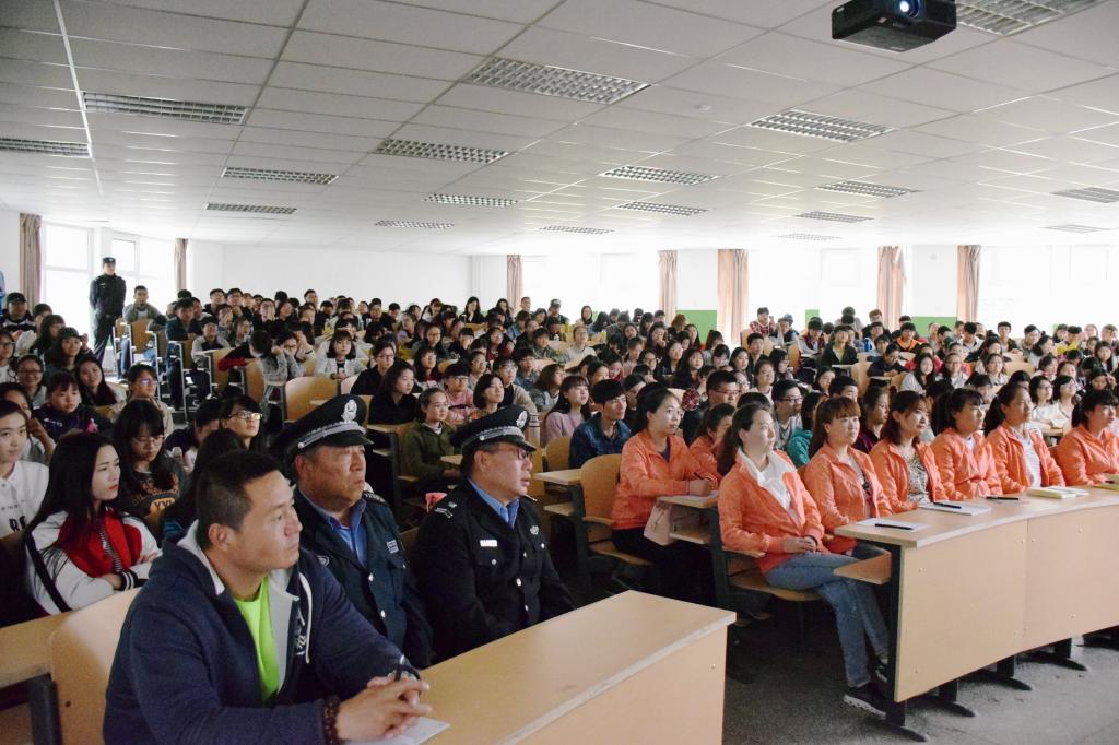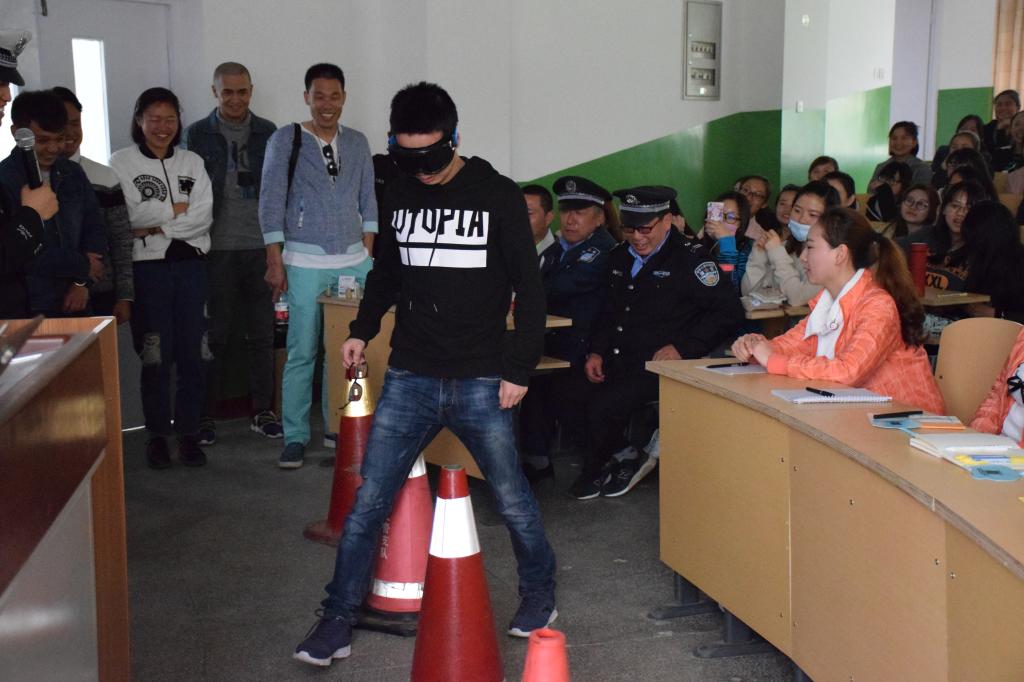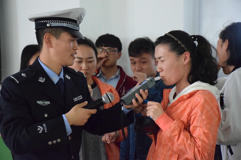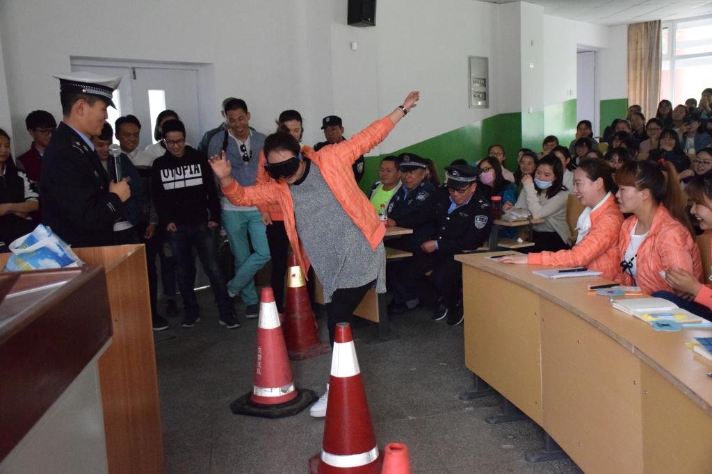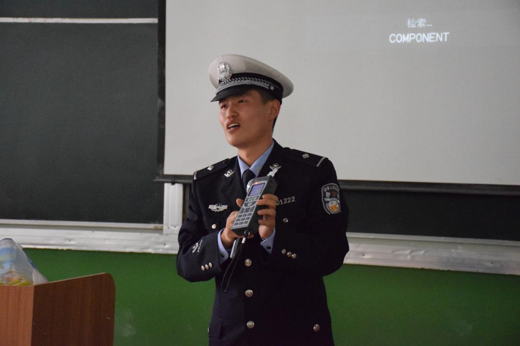 金凤区交警二大队教导员梁道柏警官在讲座开始时,详细地介绍了一些常见的交通标识和道路交通管理的相关规定,并以我们身边真实的案例分析了发生交通事故的原因,并逐一指出现在社会上各种存在安全隐患的交通行为。梁道柏警官说,随着社会的快速发展,人们出行的方式越来越便捷,而交通安全这根弦却愈发地要绷紧,时刻都不能放松,因为交通事故的发生往往就在疏忽大意的一瞬间。梁道柏警官为同学们播放了4段真实的交通事故的视频,以血淋淋的教训让大家意识到“安全措施只是一种被动的安全,而安全意识才是主动的安全”。另外,在讲到酒驾时,梁道柏警官邀请了10位同学在现场进行了生动的实验,同学们在兴致勃勃地参与和观看之间认识到了酒驾所引发的严重后果。