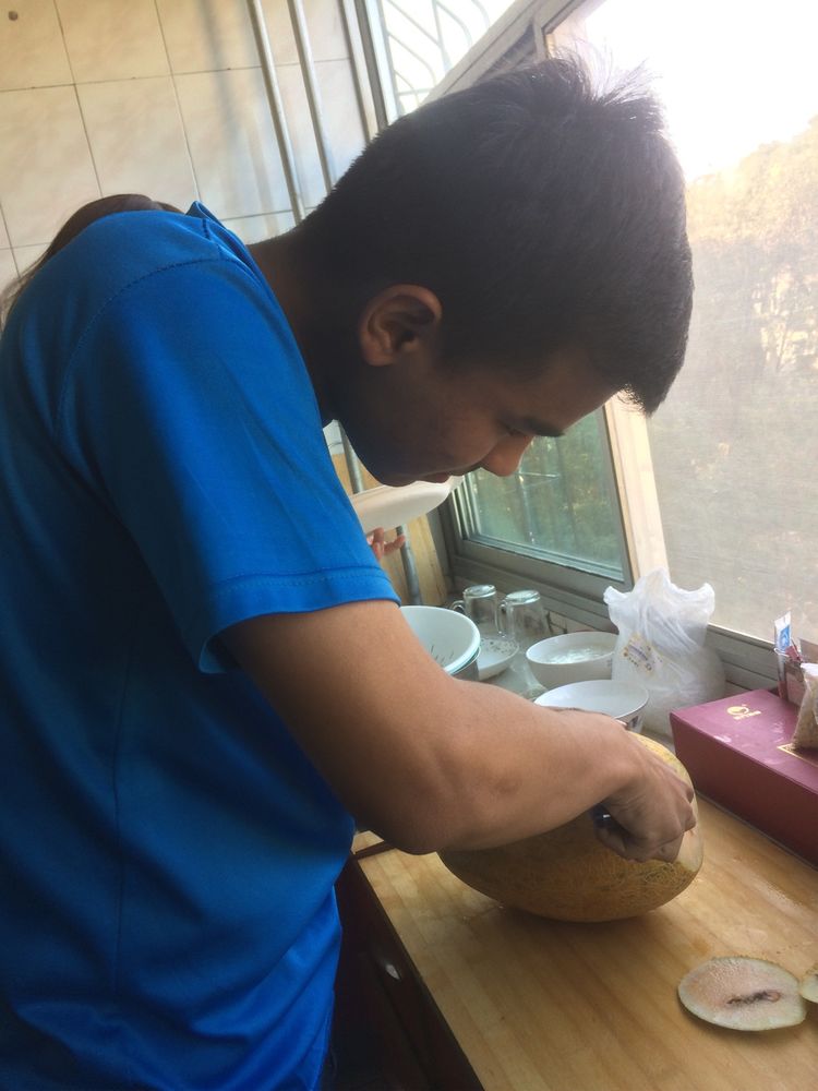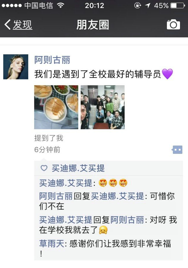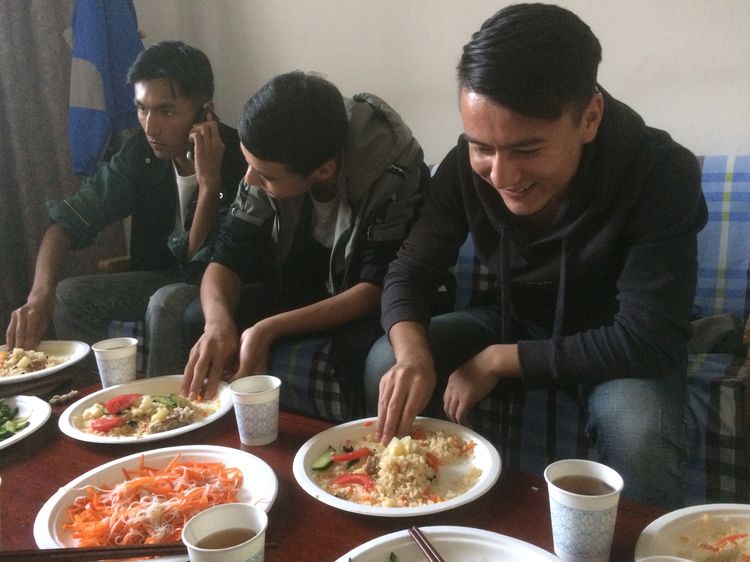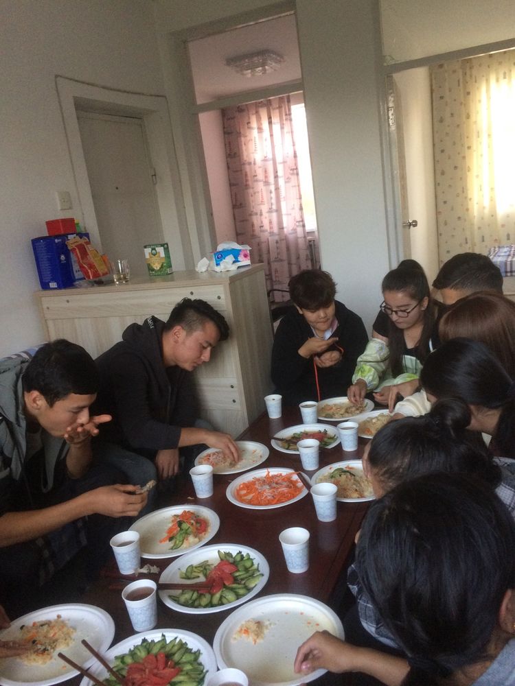 中秋节这天,许蕾老师班里的几个孩子因为勤工俭学一直到晚上还饿着肚子,于是她决定和孩子们一起在家里吃火锅共度佳节。热腾腾的火锅,不仅温暖了孩子们冰冷的双手,也温暖了一颗颗年轻的心。第二天,来自新疆的员工们受邀与许老师欢聚一堂,美丽的维吾尔族姑娘古丽克孜,独自掌勺做抓饭;能干的姑娘们苏比努尔、阿则古丽、阿力米热,切菜、淘米;帅小伙沙巴吐拉切甜瓜……孩子们吃着地道的香喷喷的手抓饭,心里洋溢着满满的幸福。10月6日,许蕾老师又邀请了不同省份的同学们来到家里,并亲自下厨为孩子们烹调了一桌桌美味可口的饭菜。来自不同地方的各民族员工唱着、笑着,手舞足蹈,一幅民族联欢的美好画卷展现在人们眼前。