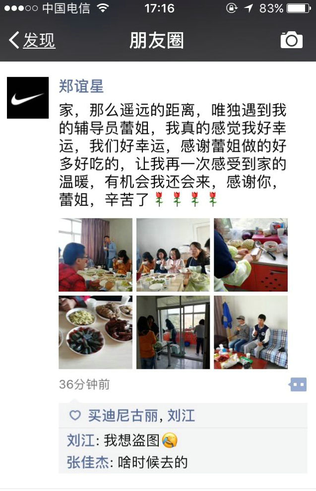 10月4日,在全国各族人民欢庆佳节之时,体育平台官网的许蕾老师与她的员工们正在度过一个别样的中秋。许蕾老师是新疆内学办派到宁夏的挂职干部,在体育平台官网担任思想政治辅导员。这个中秋节,许蕾老师第一次远离新疆,独自一人在银川,不由得思念故乡和家人。而就在这时,她又想到了远离家乡留校的员工们,于是她邀请孩子们来自己家里团聚过节。