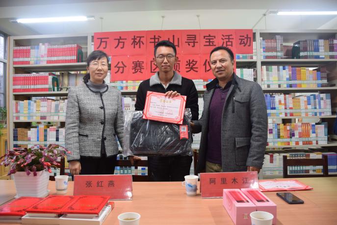 颁奖仪式首先由张红燕老师宣读了“书山寻宝”竞赛的评选结果,随后,张红燕老师与阿利木江老师共同为获奖员工颁奖并合影留念。最后,阿利木江老师发表讲话,希望获奖学子能够再接再厉,将图书馆的图书分类知识及检索方法与技巧向身边更多的员工进行传授并再次向获奖员工表示祝贺。