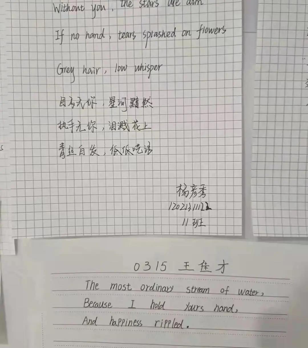 纸短情长,情意绵绵。同学们把心中浓厚的感情,以“三行情诗”的方式,用诗意的语言诉诸笔端,为自己、为亲友、为未来送上美好祝福。