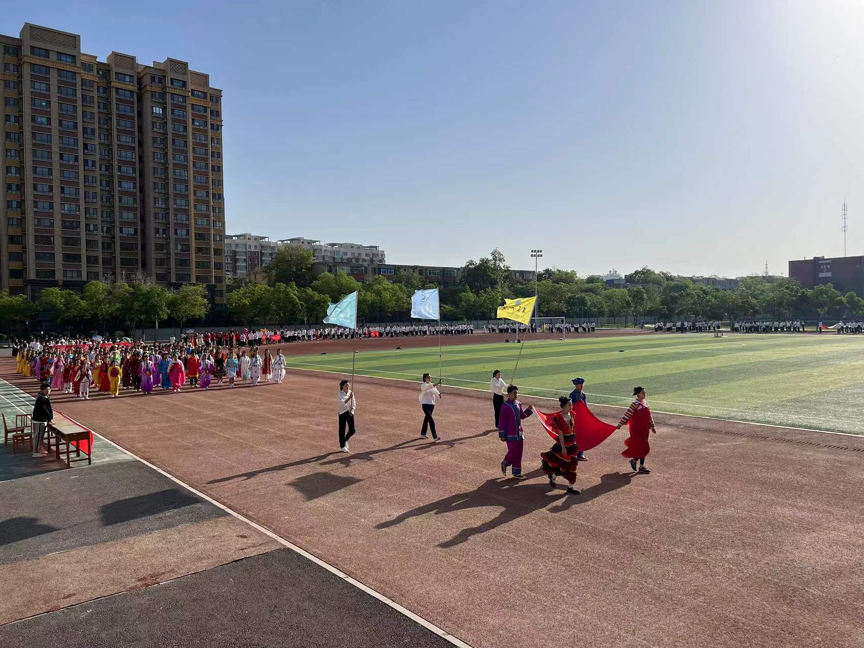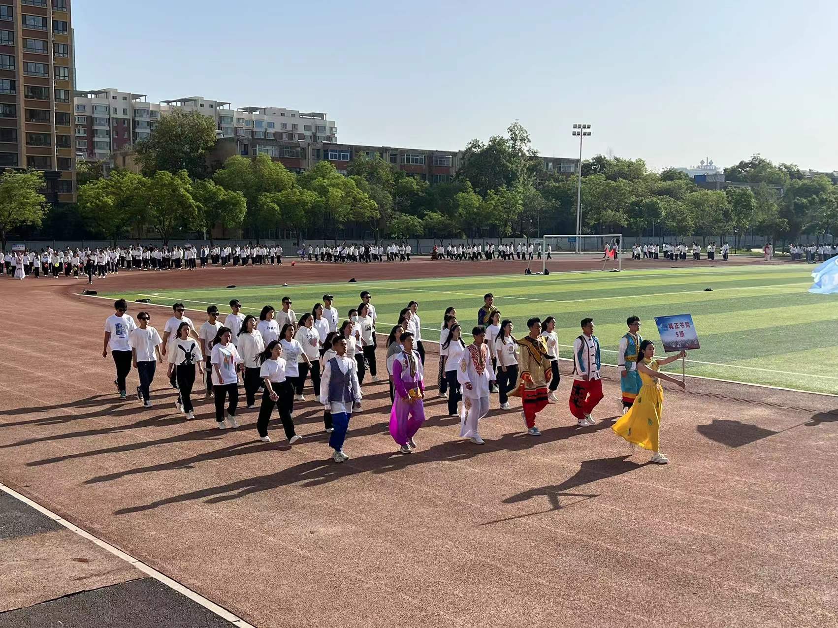 伴随现场音乐的响起,各班级依次入场,他们迈着整齐的步伐、喊着响亮的口号,以昂扬的精神面貌走过主席台前,赢得了阵阵掌声。