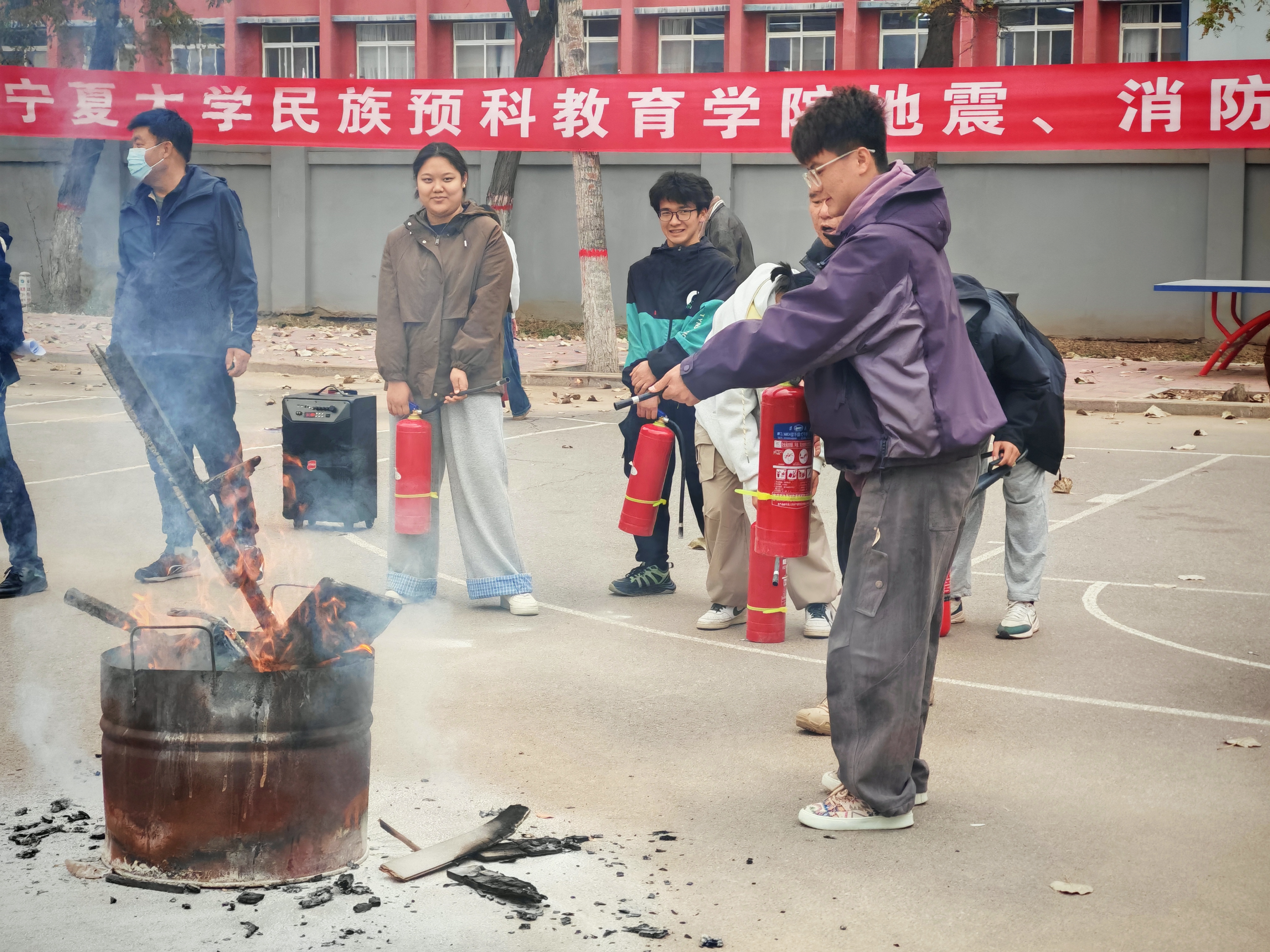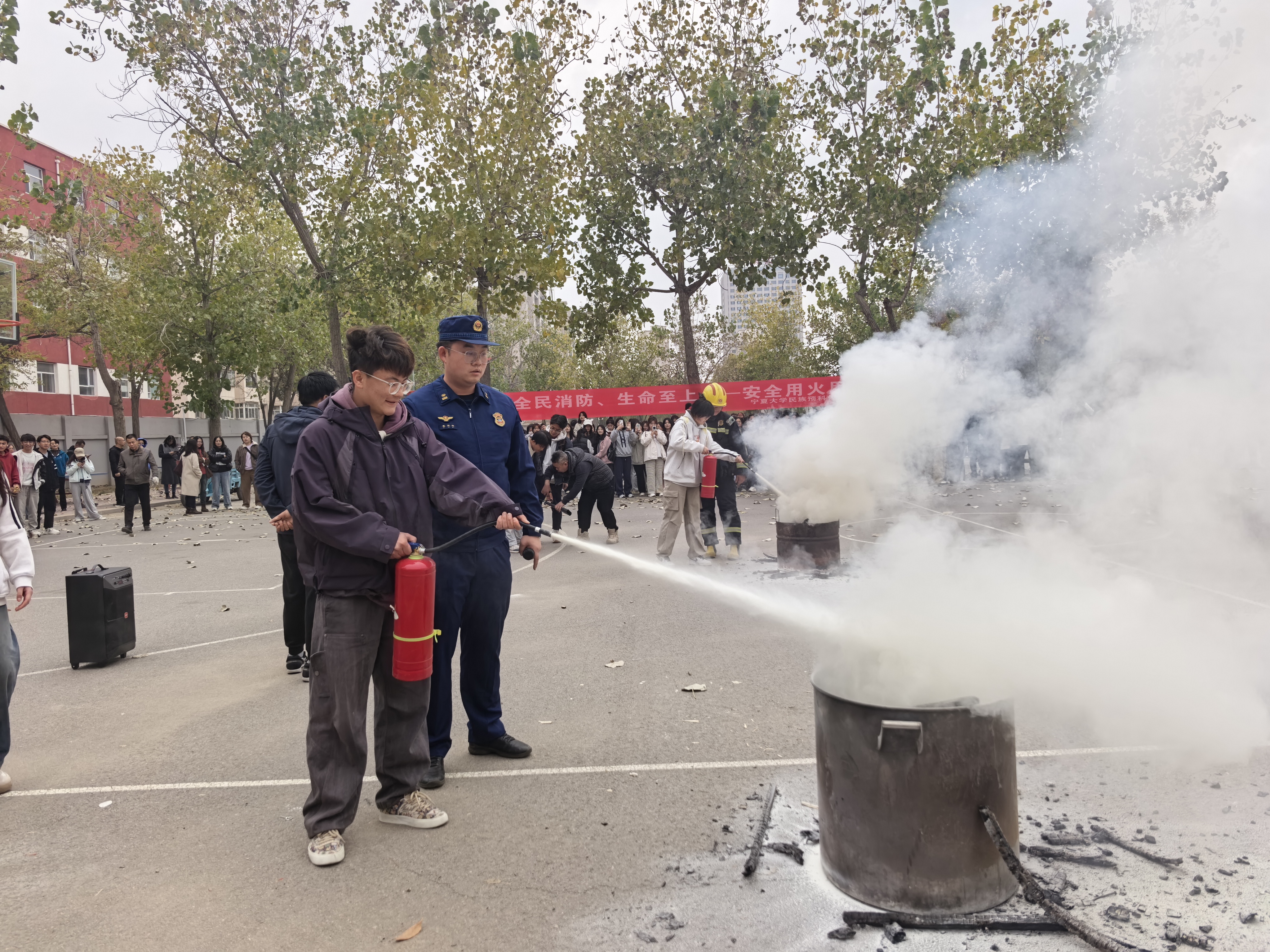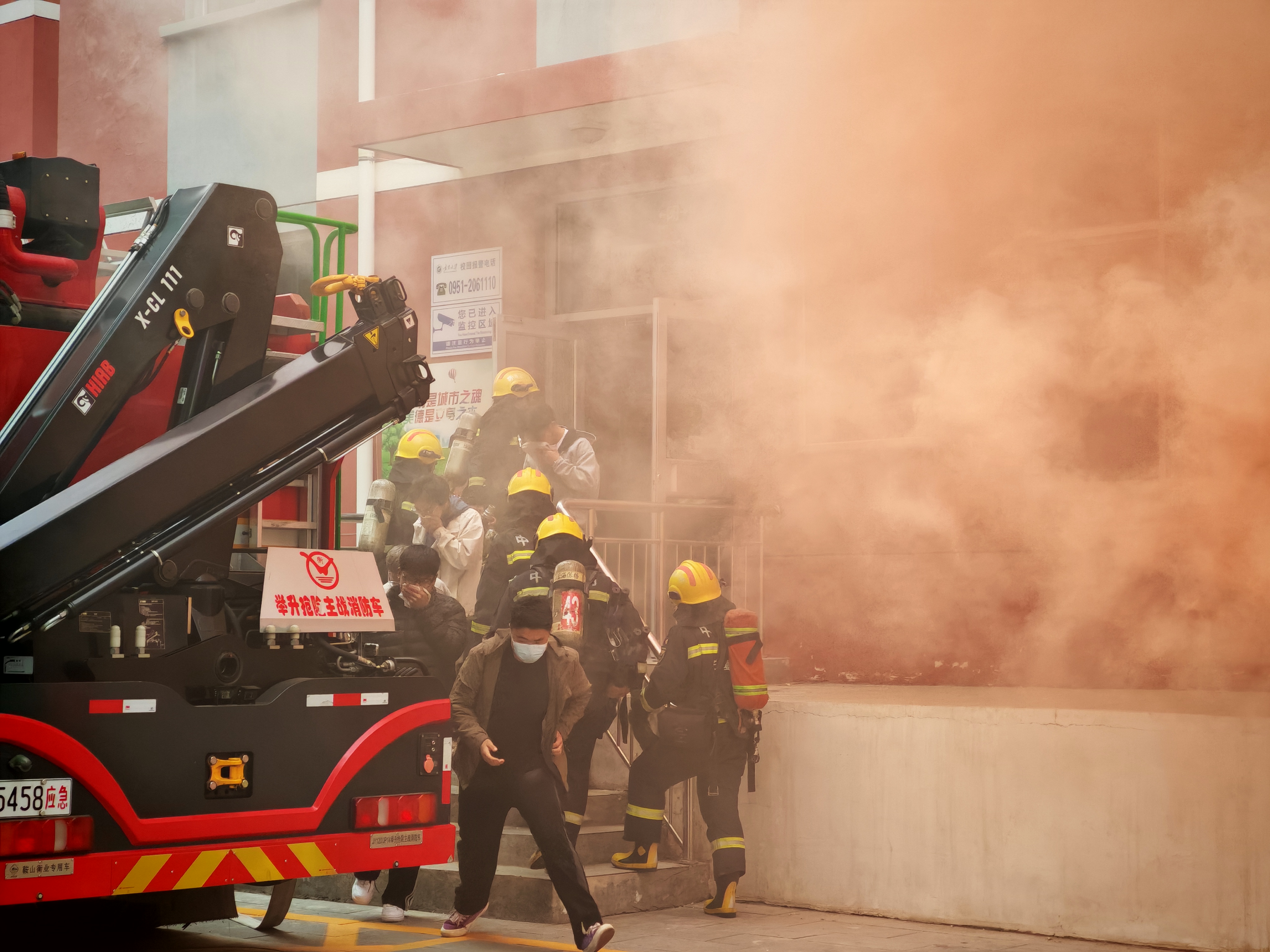 为进一步增强公司师生应对地震、消防等突发事件的应急疏散意识与自救能力,在全国第34个“消防安全日”来临前夕,11月5日下午,公司联合校保卫处、终身教育学部、银川市金凤区宁安南街消防救援站开展地震、消防逃生应急演练,参与演练的师生人数1000余人。