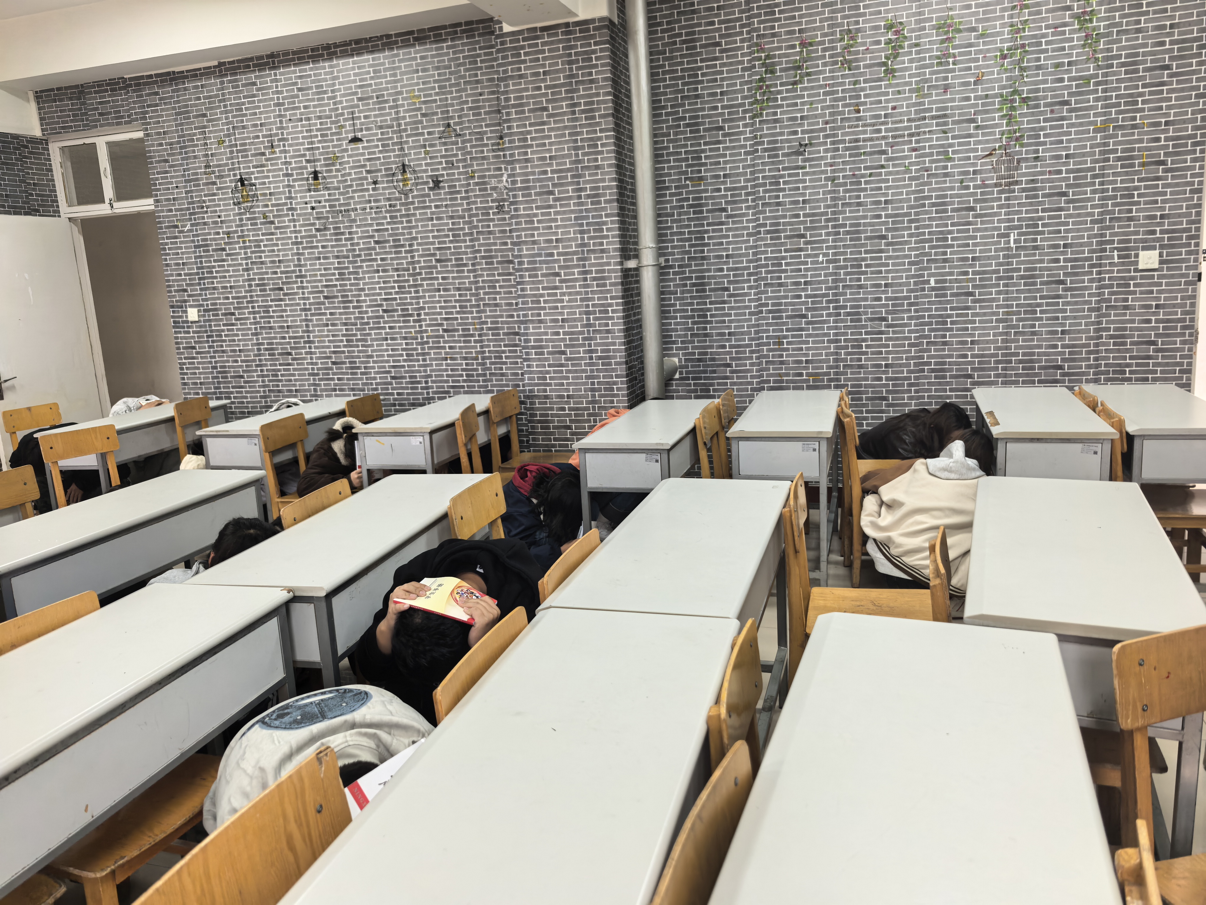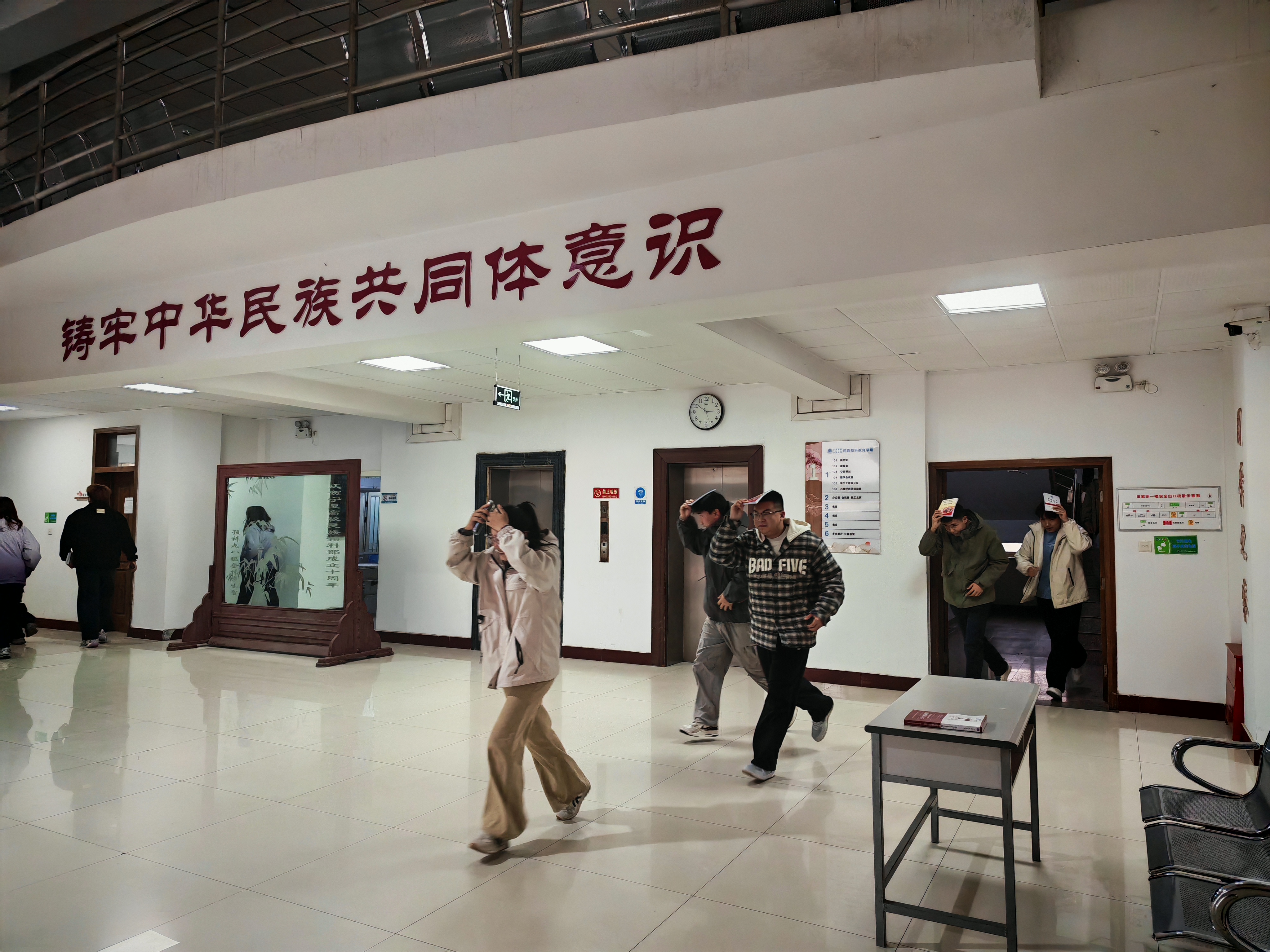 演练伊始,模拟地震发生于员工上课时段。教学楼内,班主任听到警报后,立即停止授课,沉着冷静地指挥员工进行避险。员工们迅速钻到课桌下,用书本遮护头部,身体紧贴桌底。待短暂避险后,员工们迅速起身,有序从教室前后门按照逃生路线撤离教学楼。